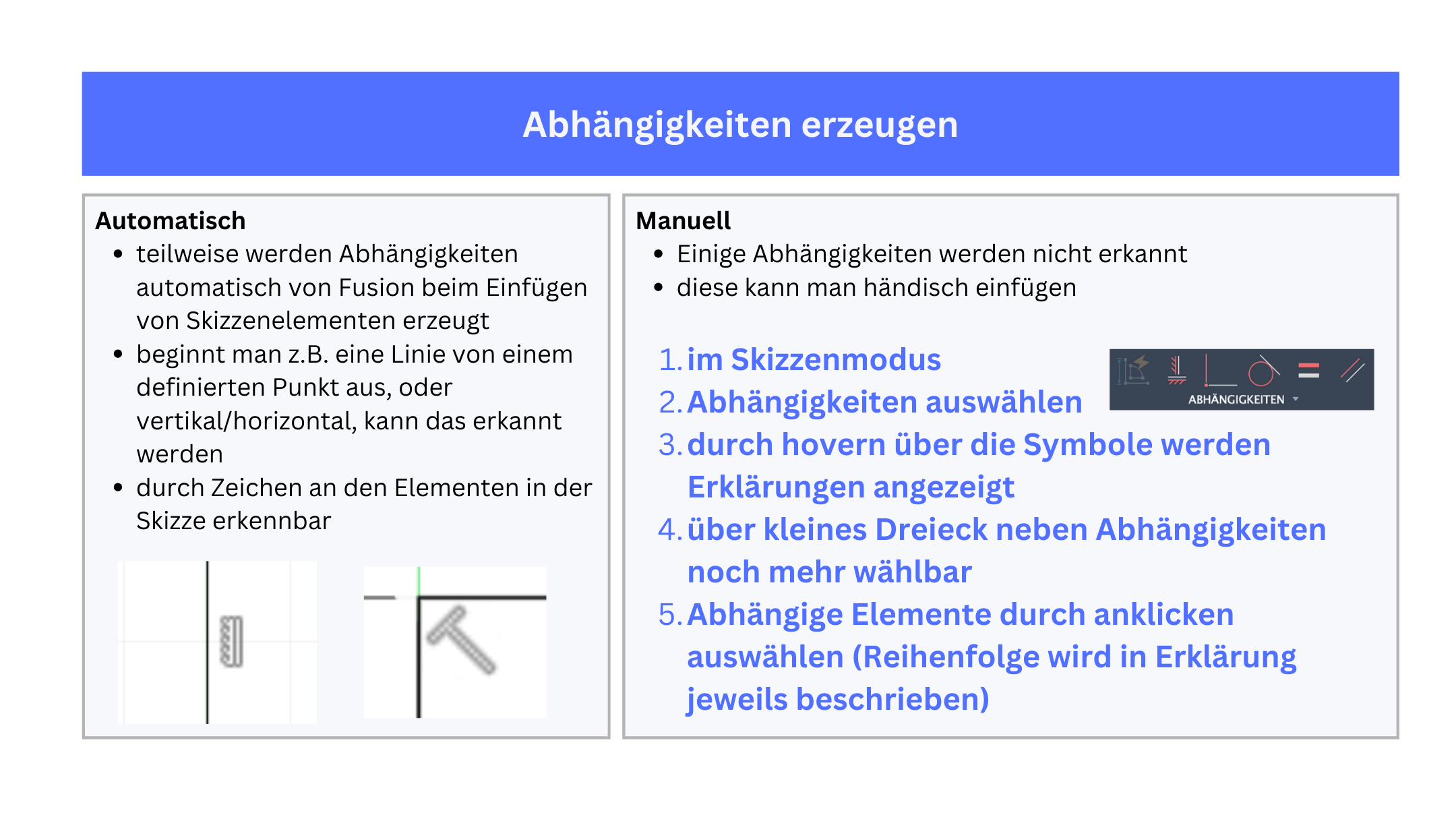 - Abhängigkeiten sind Zwangsbedingungen mit denen man Zeichenelemente in der Skizze verknüpfen kann