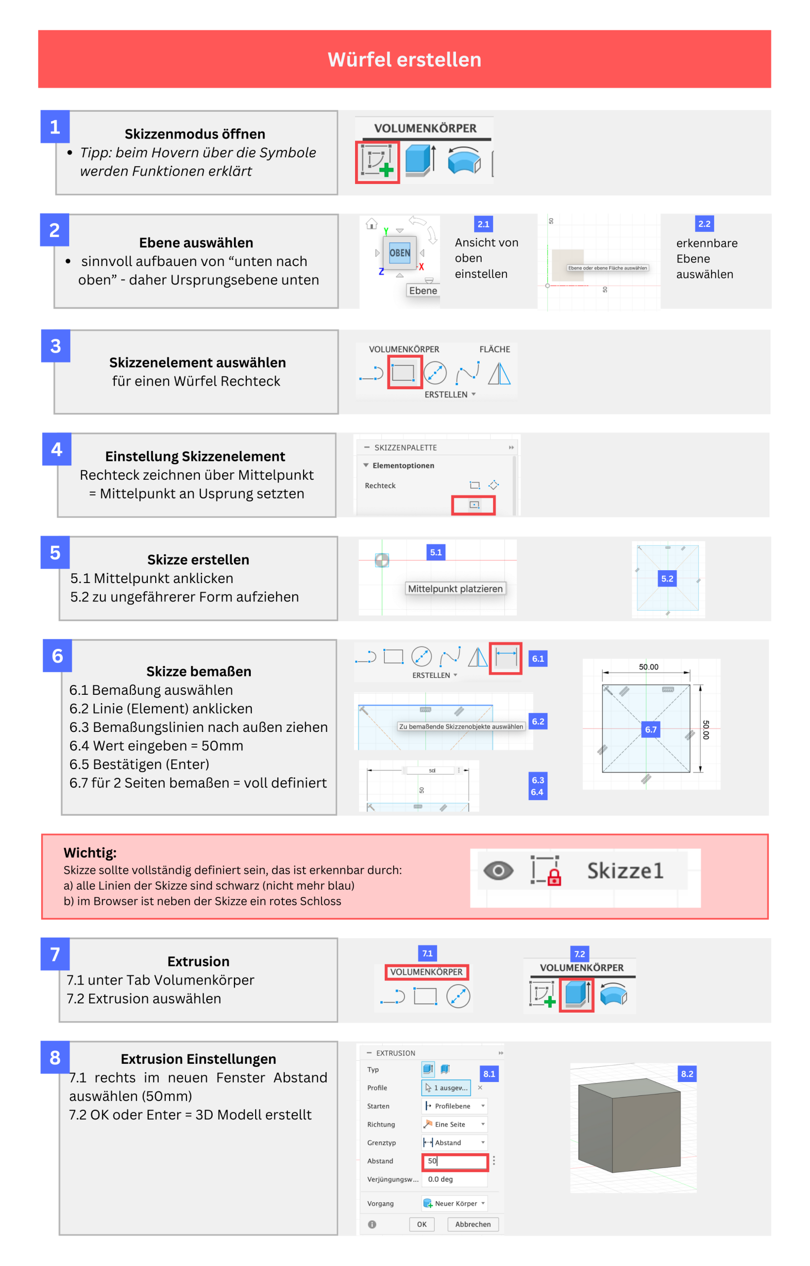 Erstelle einen Würfel der die Maße 50mmx50mmx50mm besitzt. Du kannst dich entweder selbst ausprobieren oder der folgenden Anleitung folgen
